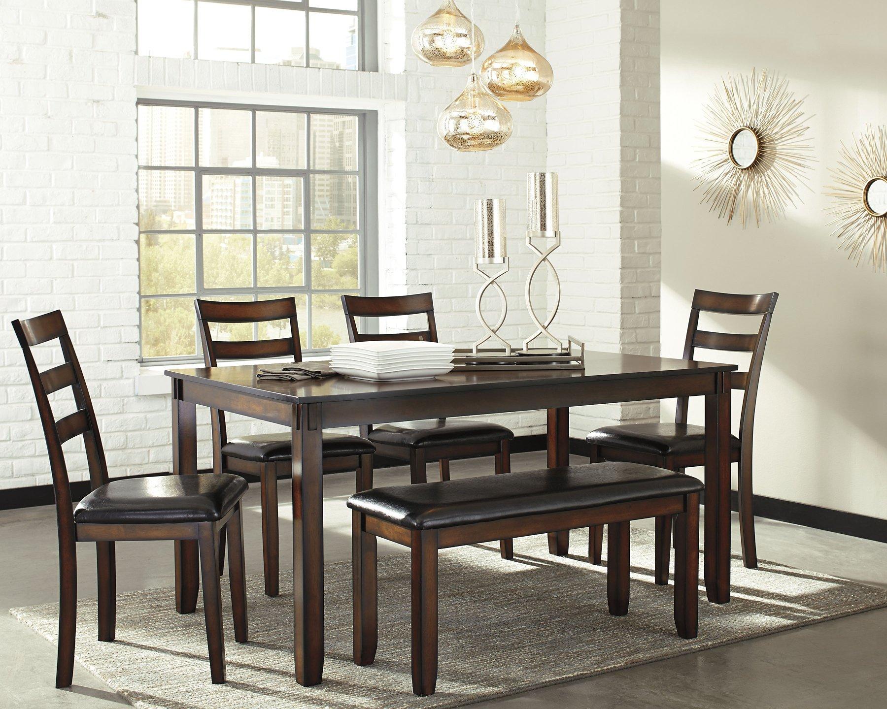 Feast your eyes on how beautiful simplicity can be. This dining room table set’s wonderfully clean-lined profile is dramatically enriched with a complex, burnished finish loaded with tonal variation and rustically refined character. Upholstered ladderback chairs are such a classic, while the addition of a comfortably cushioned bench brings a modern sensibility to the table.