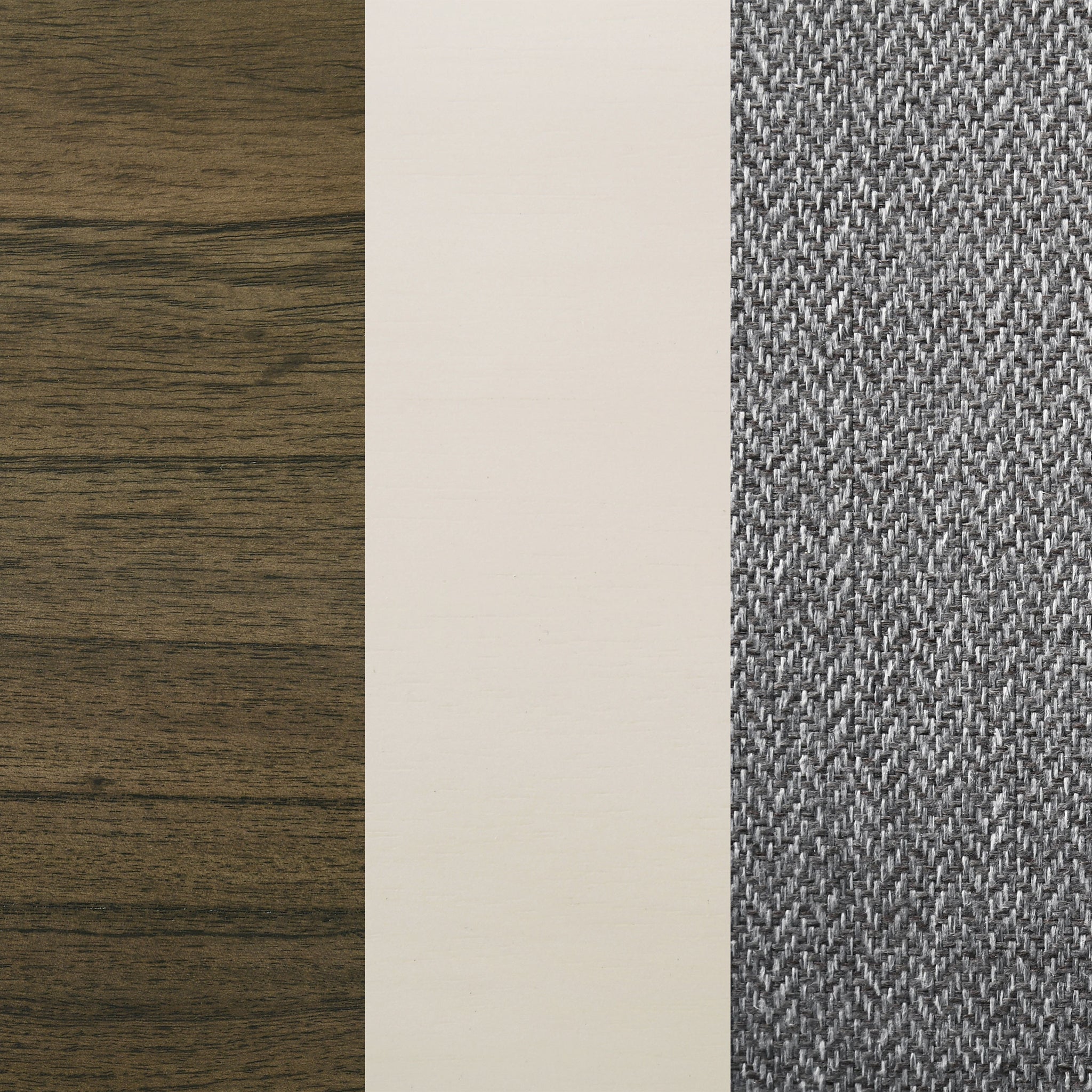 Refresh a family dining space with the cool hues and eye-catching design of this modern dining set. It includes a rectangular table and side chairs, creating an inviting centerpiece in your dining room or eat-in kitchen. The table boasts a two-tone finish with a rich wood grain tabletop complete with rounded corners, and a white finish base with chic angularity. Chairs are plush and comfortable, complete with gray fabric upholstery over plush cushions that create streamlined aesthetics in your space. The tri-tone combination is fresh and inviting, perfect for a welcoming space to catch up with friends and family.