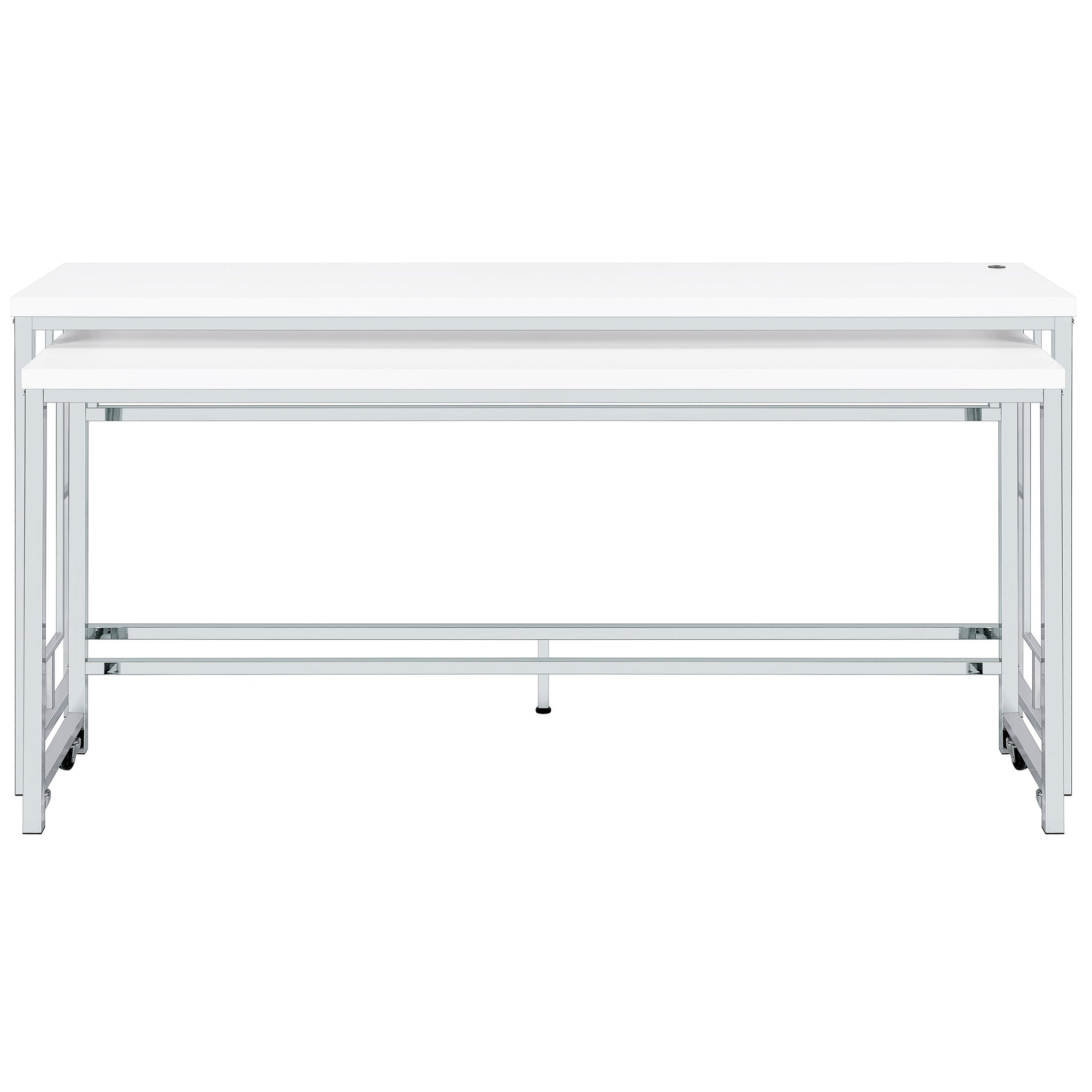 We love this modern five-piece counter height dining set in place of a console behind a floating sofa, offering exceptional versatility and refined style in any setting. It boasts two nesting tables, each long and narrow like a sofa table, but paired with three backless stools that tuck underneath. It's the perfect spot for drinks with friends on game day, or setting yourself up to work from home on a snowy day. The silver and white set features a larger table with wheels on the smaller table to create any configuration that works for you. Stools are decorated with artistic bases with open, floating frames that add Deco flair and white faux leather upholstery over padded seats for optimal comfort.