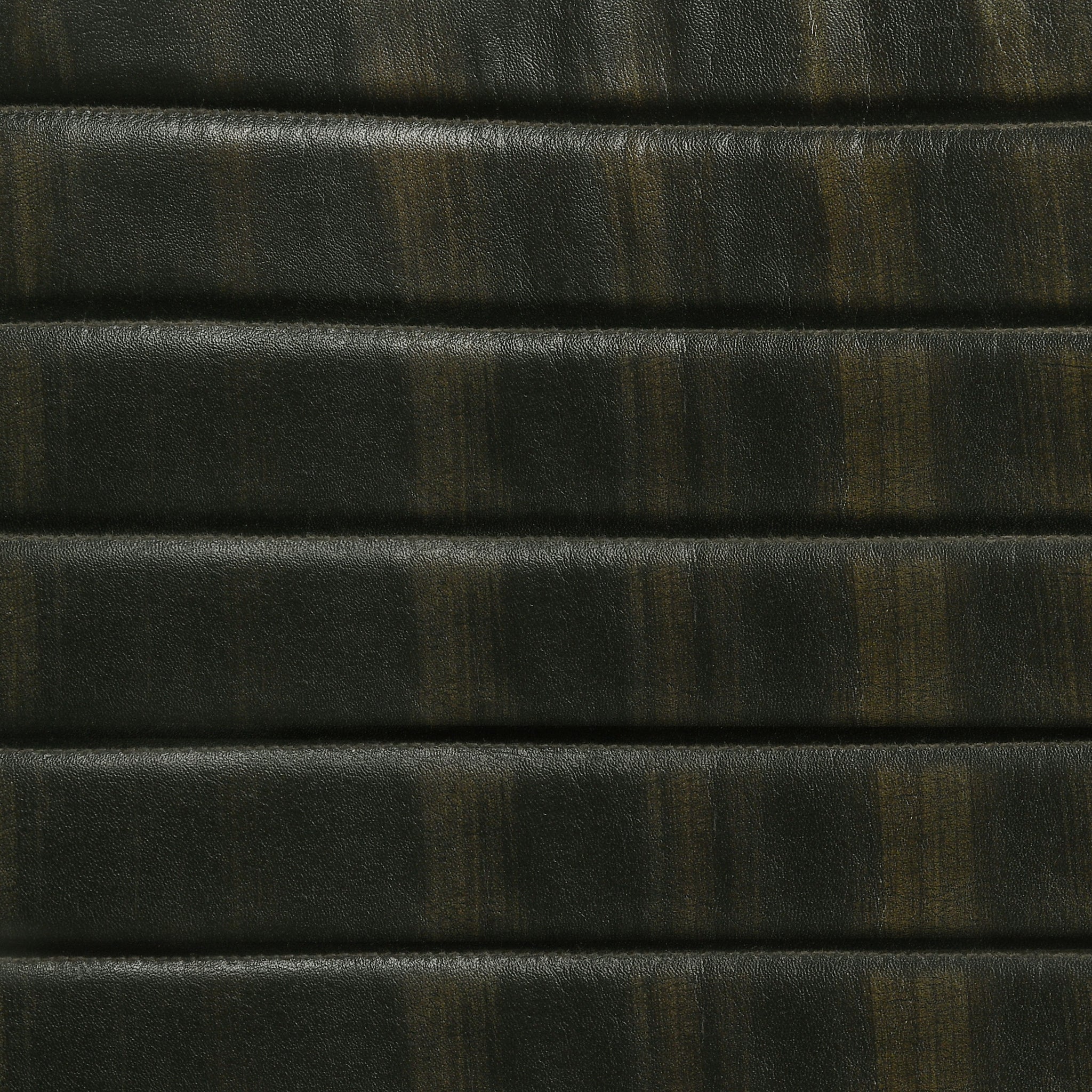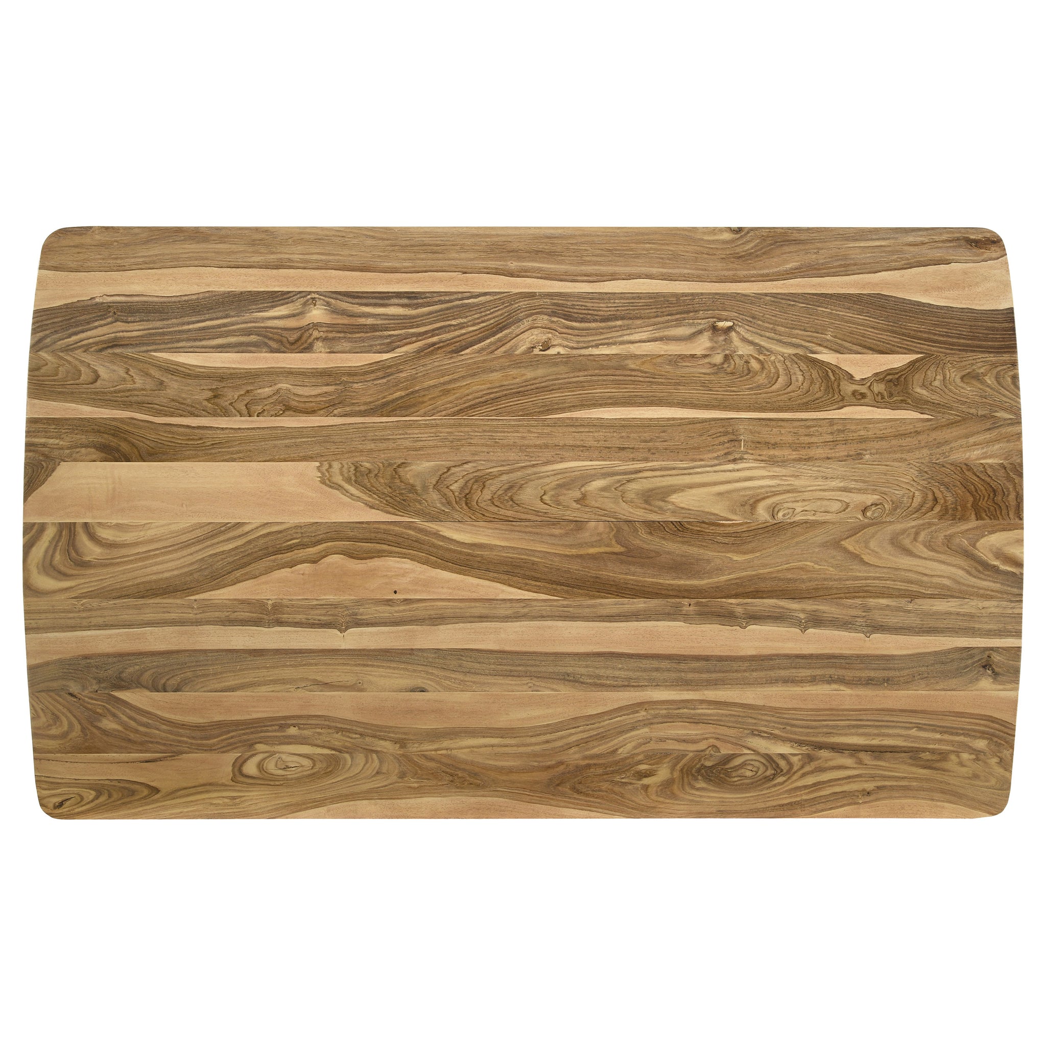 Spice up your casual space with the ranch-style influence of this seven-piece counter height dining set. Indulge in a calm vibe with a set anchored by a natural finish sheesham table featuring a spacious rectangular top and tapered, rounded legs. A dark apron with geometric design detail adds an exotic effect. Mid-Century Modern influence adds to comfortable counter stools with scoop seats and a thick back, both with horizontally channeled leather upholstery, as metal framing features iconic slender rounded, splayed legs. Set includes one rectangular counter height table and six counter stools.